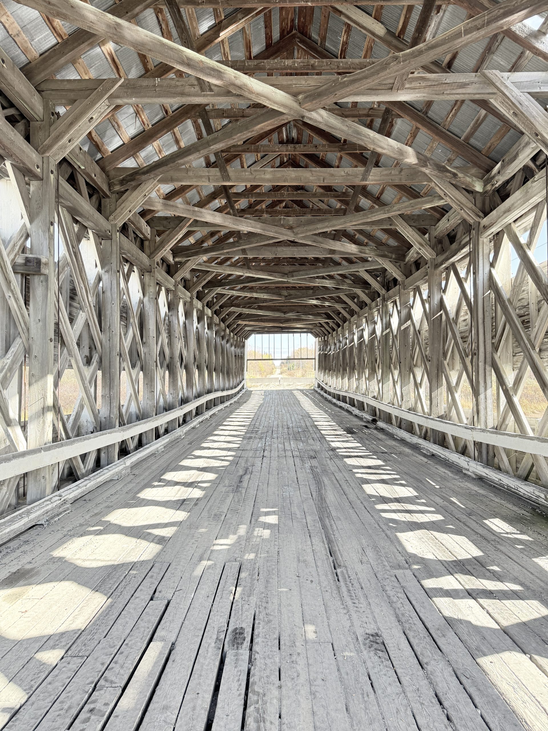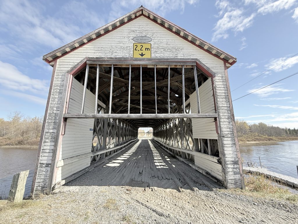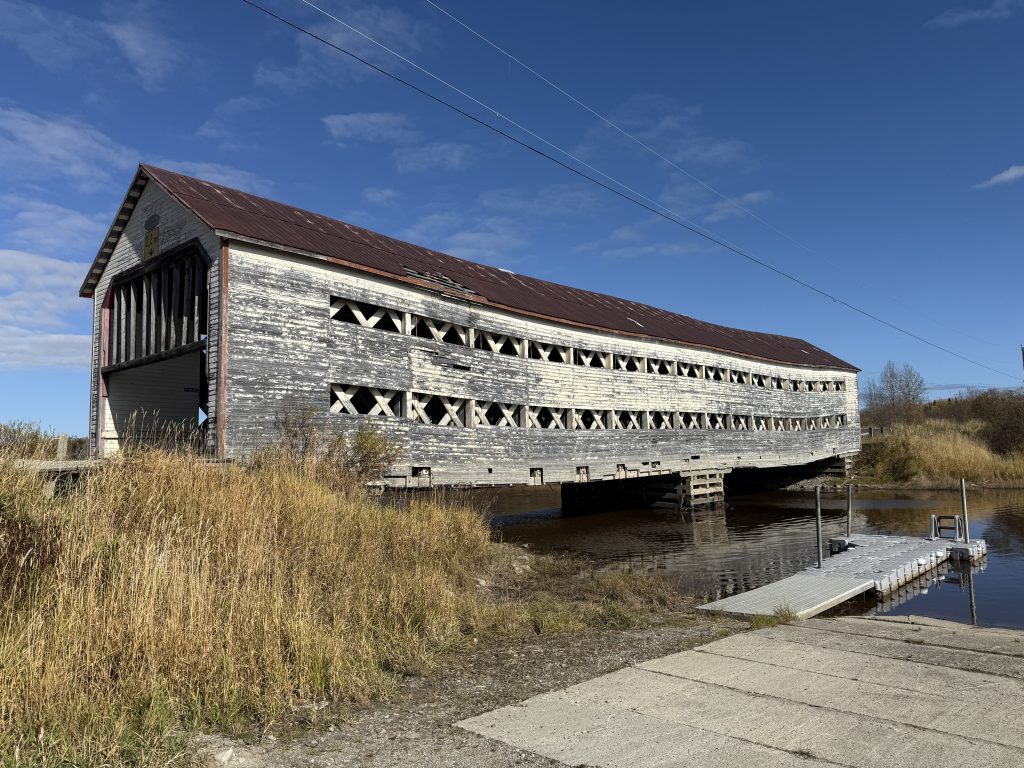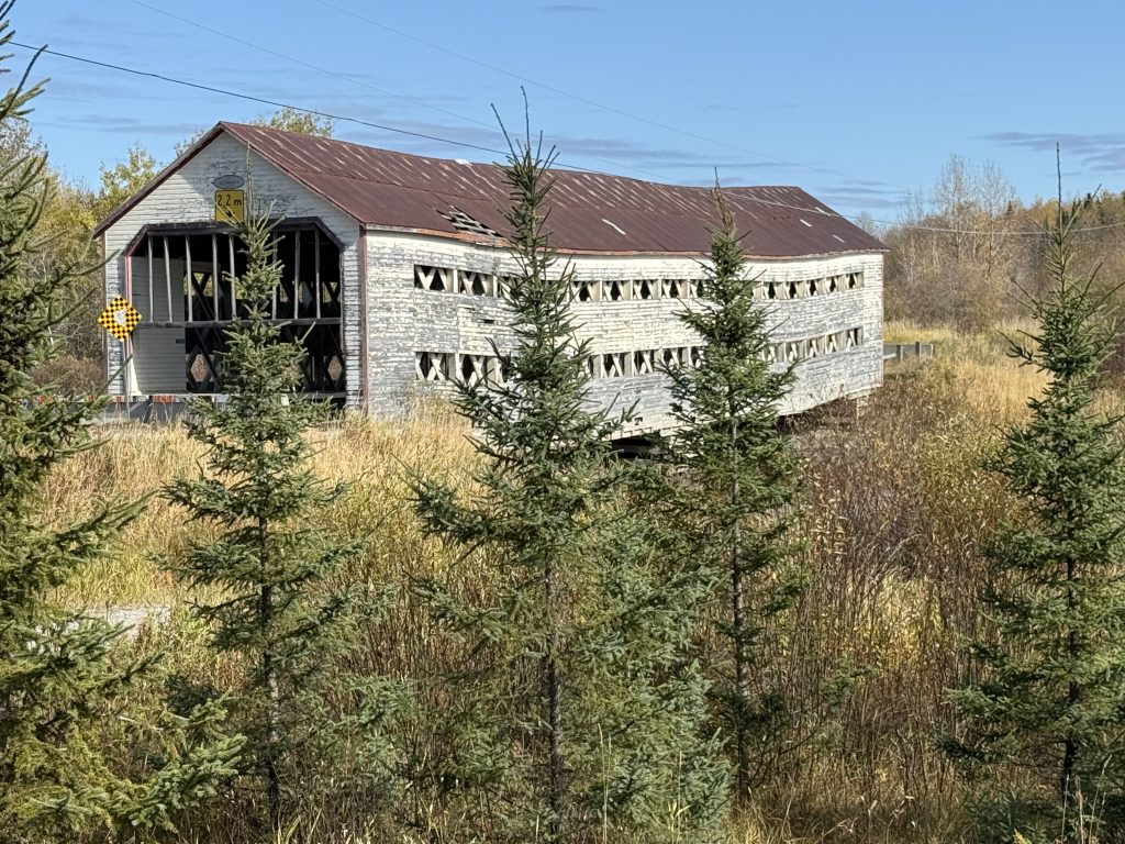 C’est au milieu du mois d’octobre que Richard s’est rendu en Abitibi. Des photos fraîches du pont Leclerc ont été publiées la semaine dernière. C’est maintenant au tour du pont du Petit-Quatre d’être en vedette grâce aux clichés de notre collaborateur. Cette structure, qu’on peut voir apparaître de loin au sommet d’une colline lorsqu’on emprunte le rang, est vraiment en pleine nature. Il n’y a pas de maisons à proximité, que la forêt. Équipé de gabarits depuis 2021, année où il a été restauré, le pont du Petit-Quatre est demeuré en grande forme. L’unique graffiti visible dans le pont y est depuis un bon moment déjà. Construit en 1950, il figure parmi les derniers ponts couverts construits alors que cette technologie a été mise de côté dans cette décennie. Merci à Richard pour les photos du jour.