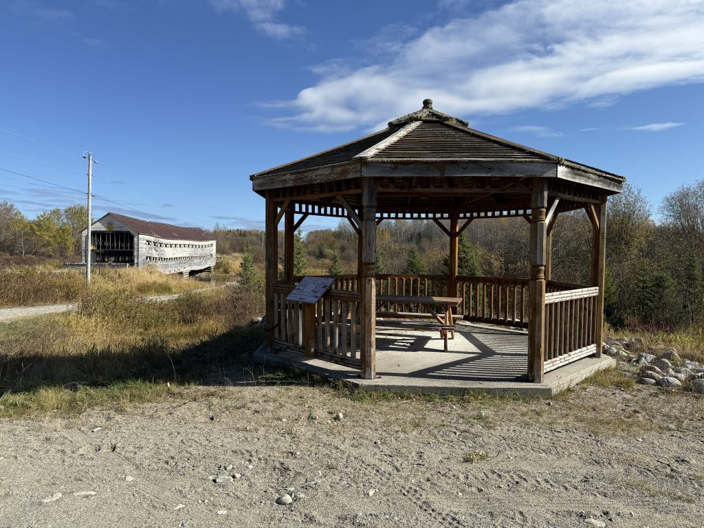 Notre ami Richard a pris de magnifiques photos lors de son récent passage en Abitibi. C’est le pont des Souvenirs qui est en vedette aujourd’hui. Il y a peu de changement pour cette structure qui est toujours laissée à elle-même : tôle trouée ou manquante dans la couverture, lambris endommagé et bois pourri à certains endroits sur le tablier. Bien que fermé depuis 15 ans déjà, les VTT continuent à utiliser le pont grâce à un accès de contournement improvisé. Le site demeure très agréable à fréquenter avec une halte comprenant un abri et une table, de même qu’une rampe de mise à l’eau. Merci à Richard pour les photos du jour.