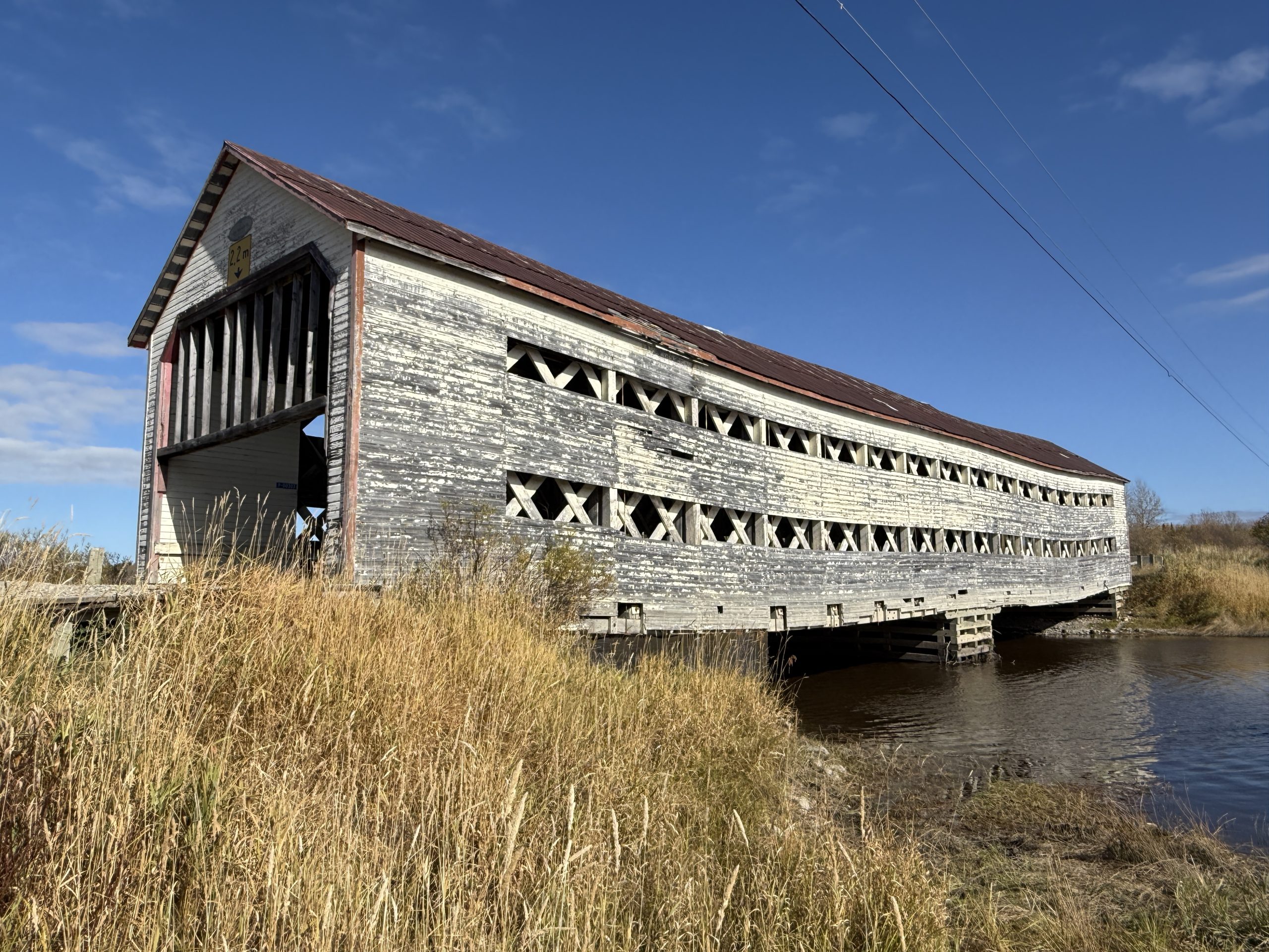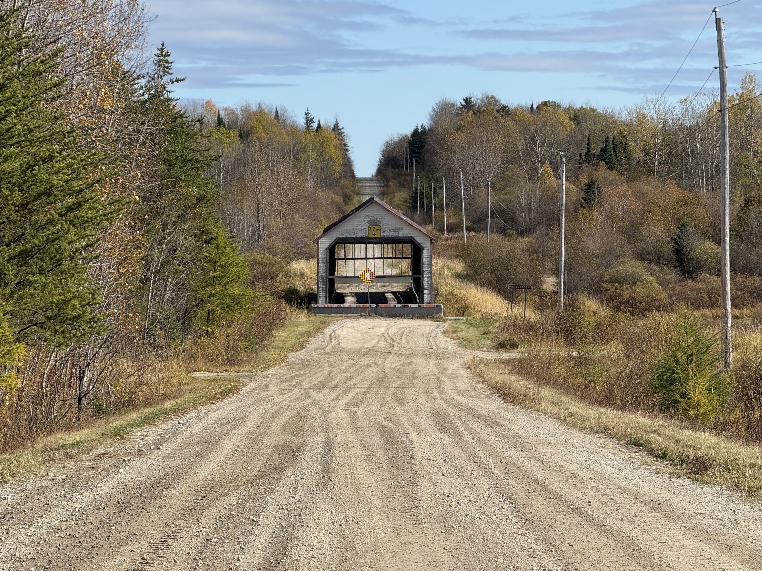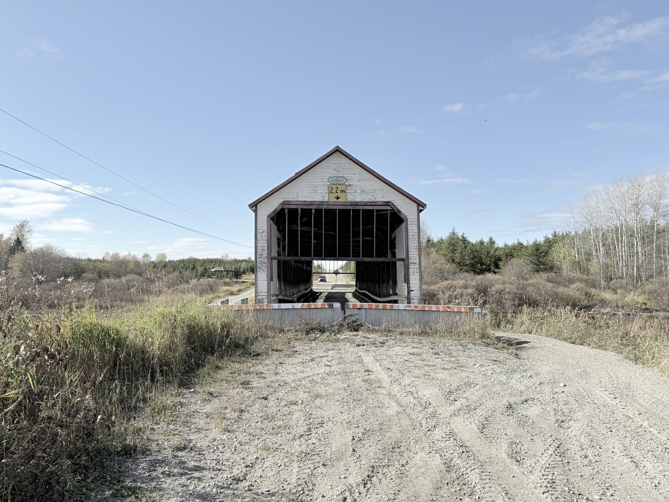 C’est au milieu du mois d’octobre que Richard s’est rendu en Abitibi. Des photos fraîches du pont Leclerc ont été publiées la semaine dernière. C’est maintenant au tour du pont du Petit-Quatre d’être en vedette grâce aux clichés de notre collaborateur. Cette structure, qu’on peut voir apparaître de loin au sommet d’une colline lorsqu’on emprunte le rang, est vraiment en pleine nature. Il n’y a pas de maisons à proximité, que la forêt. Équipé de gabarits depuis 2021, année où il a été restauré, le pont du Petit-Quatre est demeuré en grande forme. L’unique graffiti visible dans le pont y est depuis un bon moment déjà. Construit en 1950, il figure parmi les derniers ponts couverts construits alors que cette technologie a été mise de côté dans cette décennie. Merci à Richard pour les photos du jour.