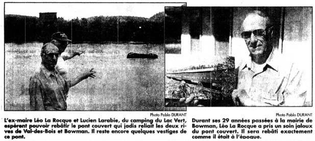 Pour les résidants, surtout les plus âgés, se sont de bons souvenirs qui sont partis en fumée aux petites heures, hier. «C'était agréable de franchir le pont, se rappelle Thérèse Morin, qui habite Bowman depuis 1934, surtout que son mari a participé à sa construction. «Le monde est rendu méchant», a ajouté la vieille dame qui croit que le feu a été allumé par un incendiaire.
