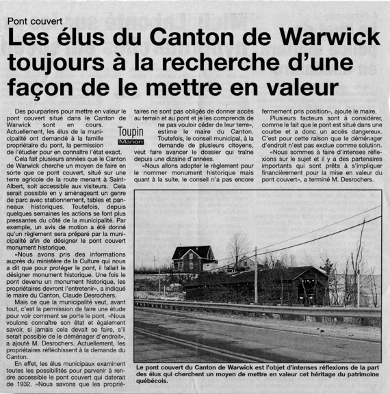 LE 1ER AVRIL, la municipalité de Warwick deviendra propriétaire du pont couvert qui enjambe la rivière des Pins, à quelques pas du chemin Saint-Albert.