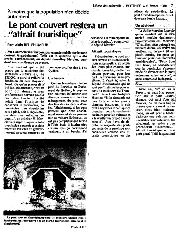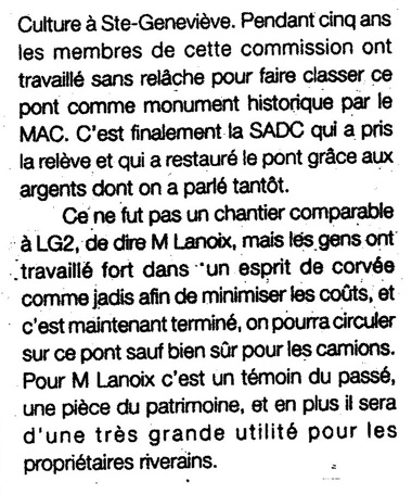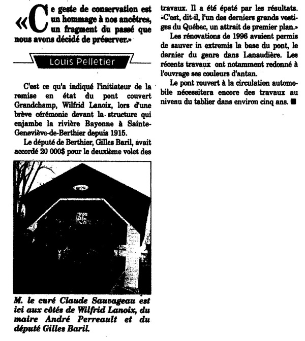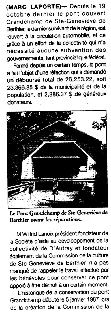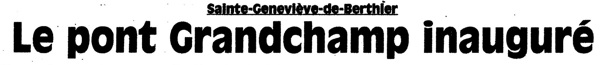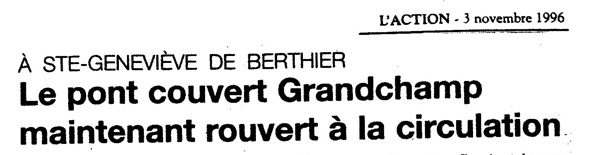 En terminant, quelques articles de journaux portant sur les principales étapes dans la vie du pont Grandchamp : sa fermeture, ses rénovations et sa réouverture, le tout sur une période de plus de 20 ans. À lire attentivement pour prendre exemple sur cette histoire. Pourquoi ne pas faire de même avec certains autres ponts?