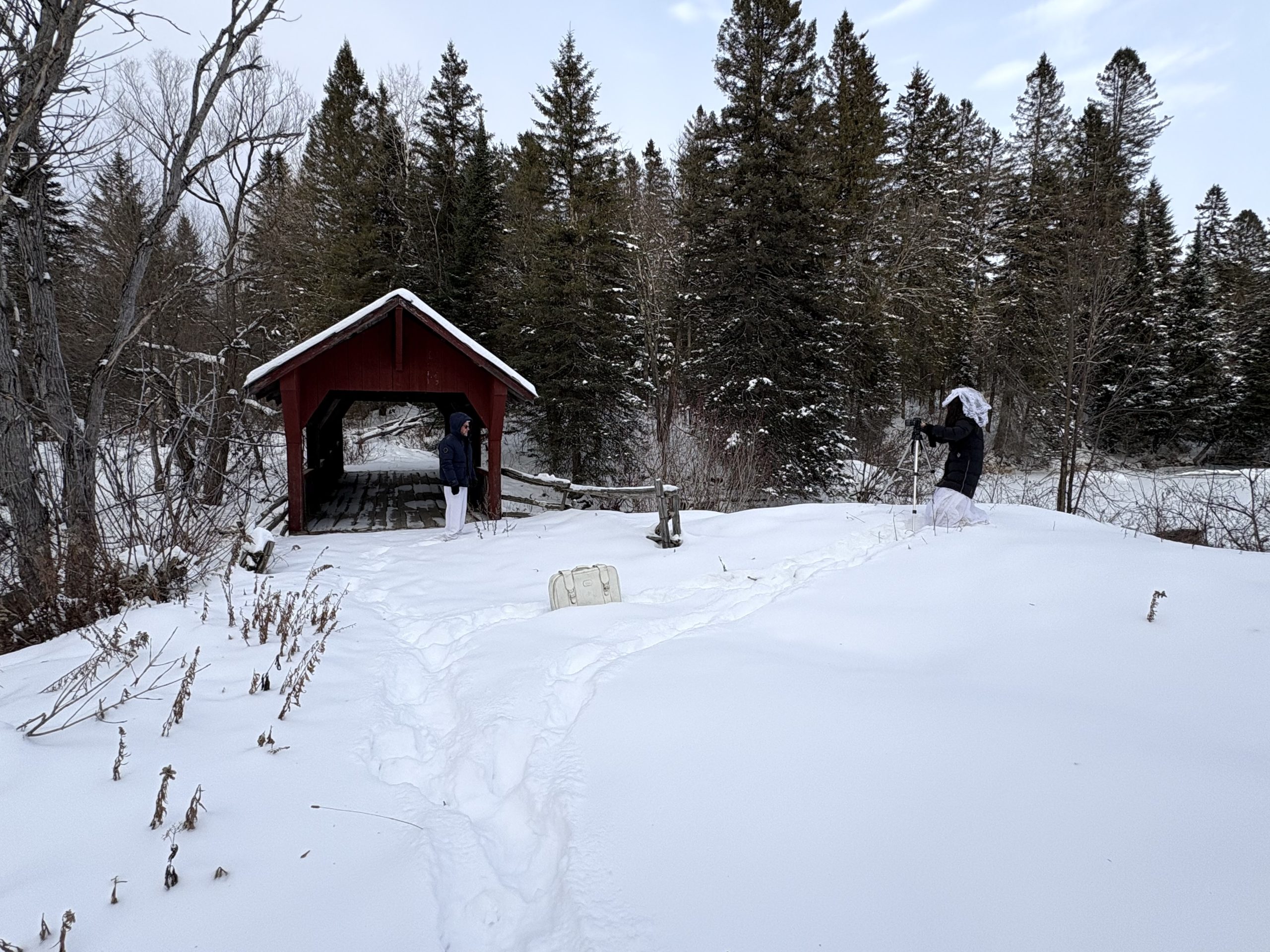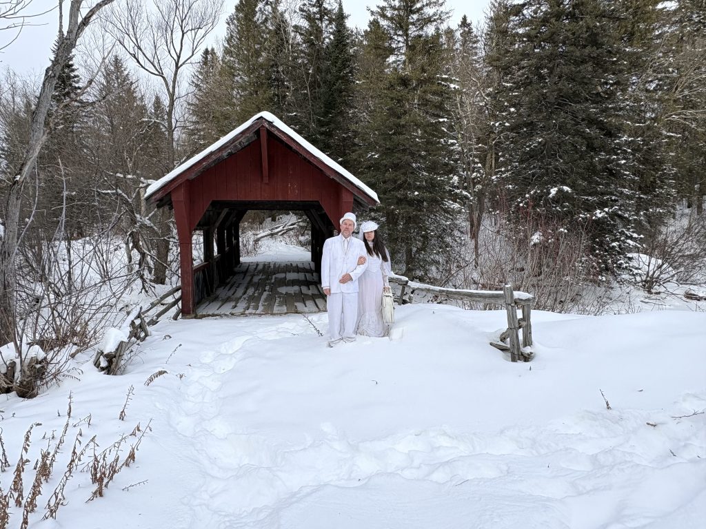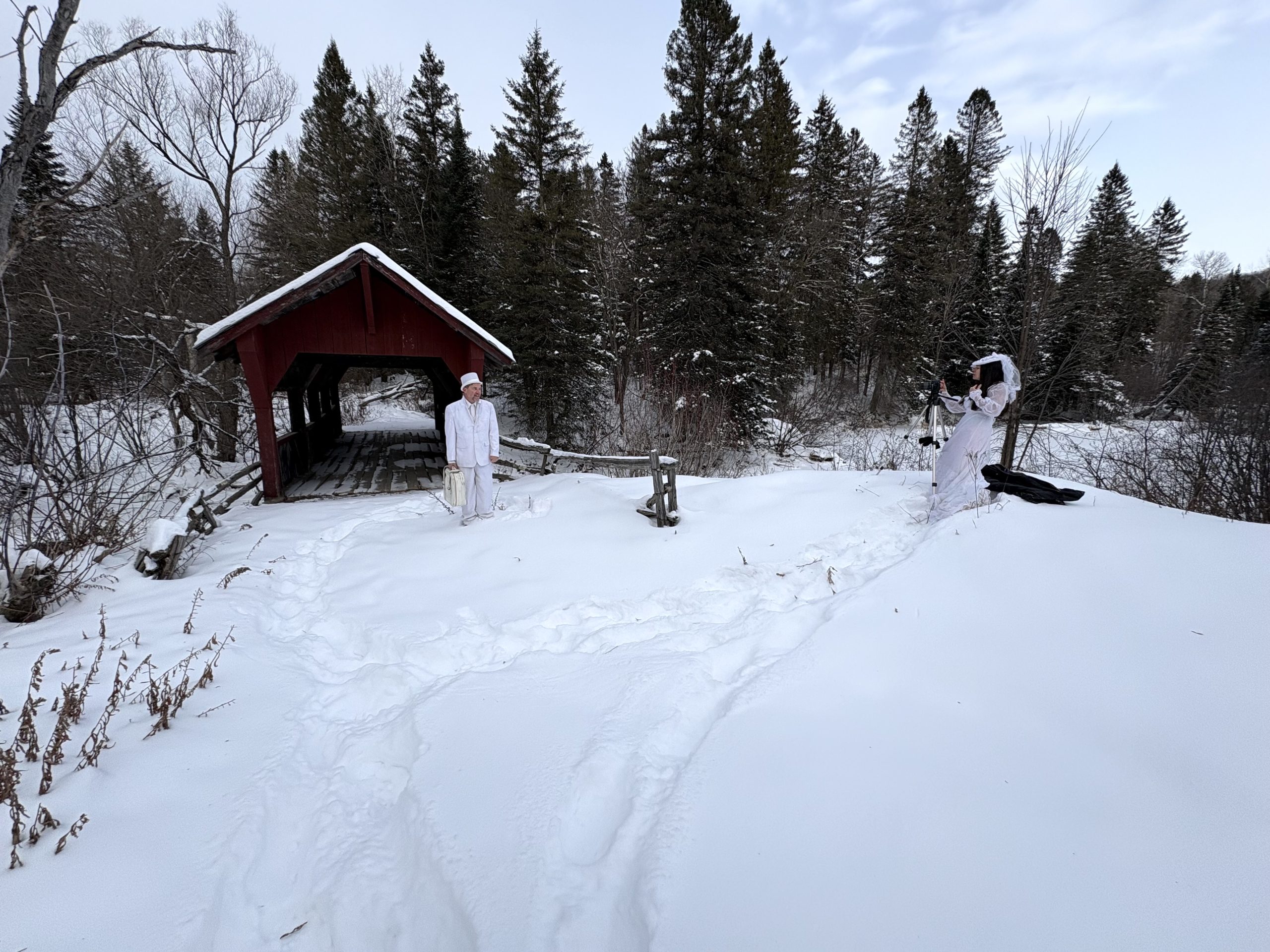 Le projet photographique Témoins de notre histoire s’est terminé en juillet 2023 avec l’ultime mise en scène au pont Émile-Lapointe. Pour l’artiste Sylvie Crépeault, c’était le dernier mariage puisque tous les ponts couverts avaient été visités. La seule structure qui avait été écartée du projet est le pont Edward. Il y avait deux raisons pour cela. D’abord, le pont ne dessert plus le réseau routier et il a été reconstruit en utilisant le bois d’un pont couvert emporté par les glaces en 1964. Ensuite, comme il a été reconstruit au Village Canadiana de Rawdon, site fermé au public depuis plus de 30 ans, il n’était pas vraiment accessible. Mais depuis un an tout ceci a changé car le village ouvre à l’occasion pour des évènements spéciaux. Pendant deux week-ends de décembre, un incroyable festival de Noël s’est tenu au village historique. C’était donc l’occasion idéale de ressuciter le projet. Que de plaisir nous avons eu à replonger dans l’aventure… C’était un beau défi avec la neige et le froid et cela donne un cachet bien particulier à la photo retenue. Je joins dans la galerie des photos prises le 7 décembre lors de notre passage à Rawdon. Si tout se passe bien, il est prévu d’ouvrir à nouveau le Village Canadiana au public au courant de l’année. Et pour ce qui est du projet Témoins de notre histoire, tout n’est pas réellement fini car de très bonnes nouvelles sont à venir. Le blogue prend une petite pause pour le temps des Fêtes et sera de retour au début du mois de janvier avec le célèbre bilan annuel. J’en frofite pour souhaiter un Joyeux Noël et une très bonne année 2026 à tous les lecteurs.