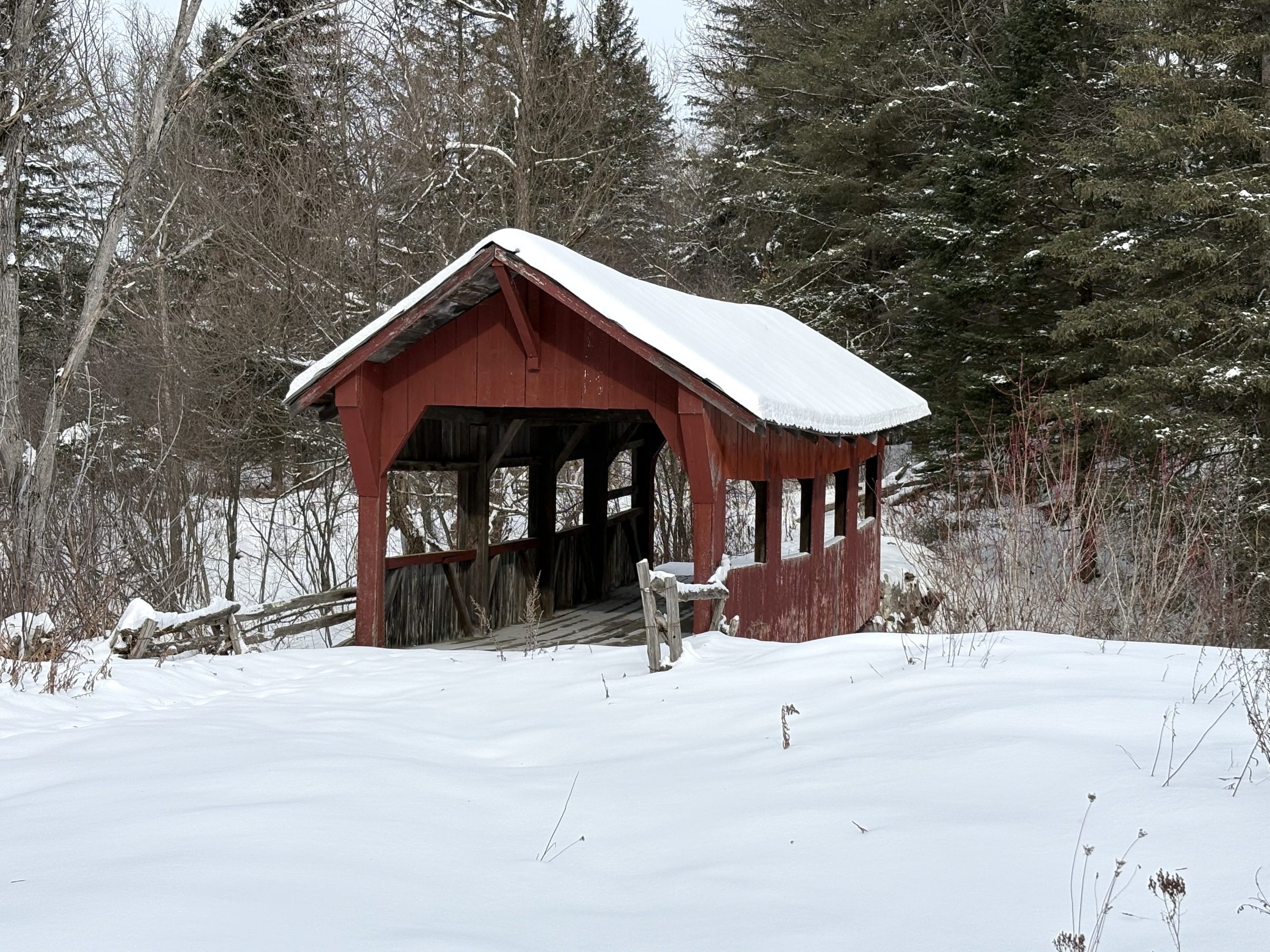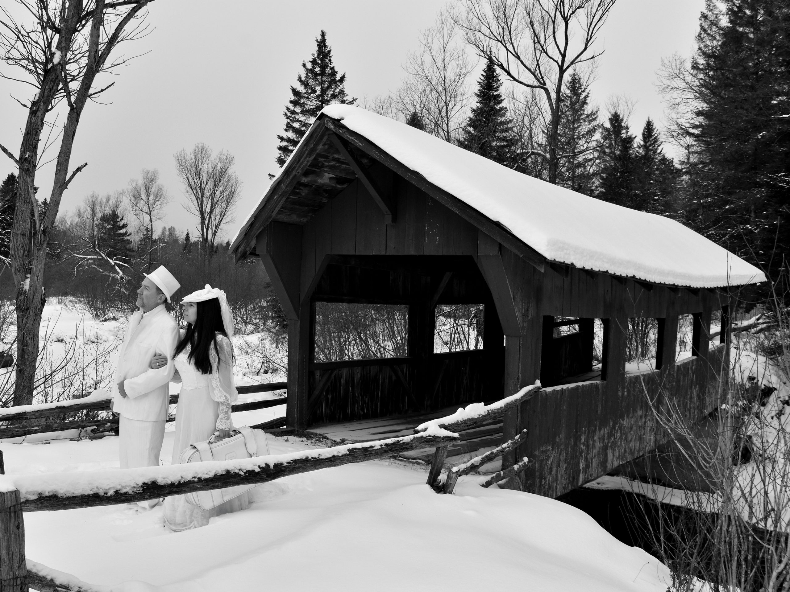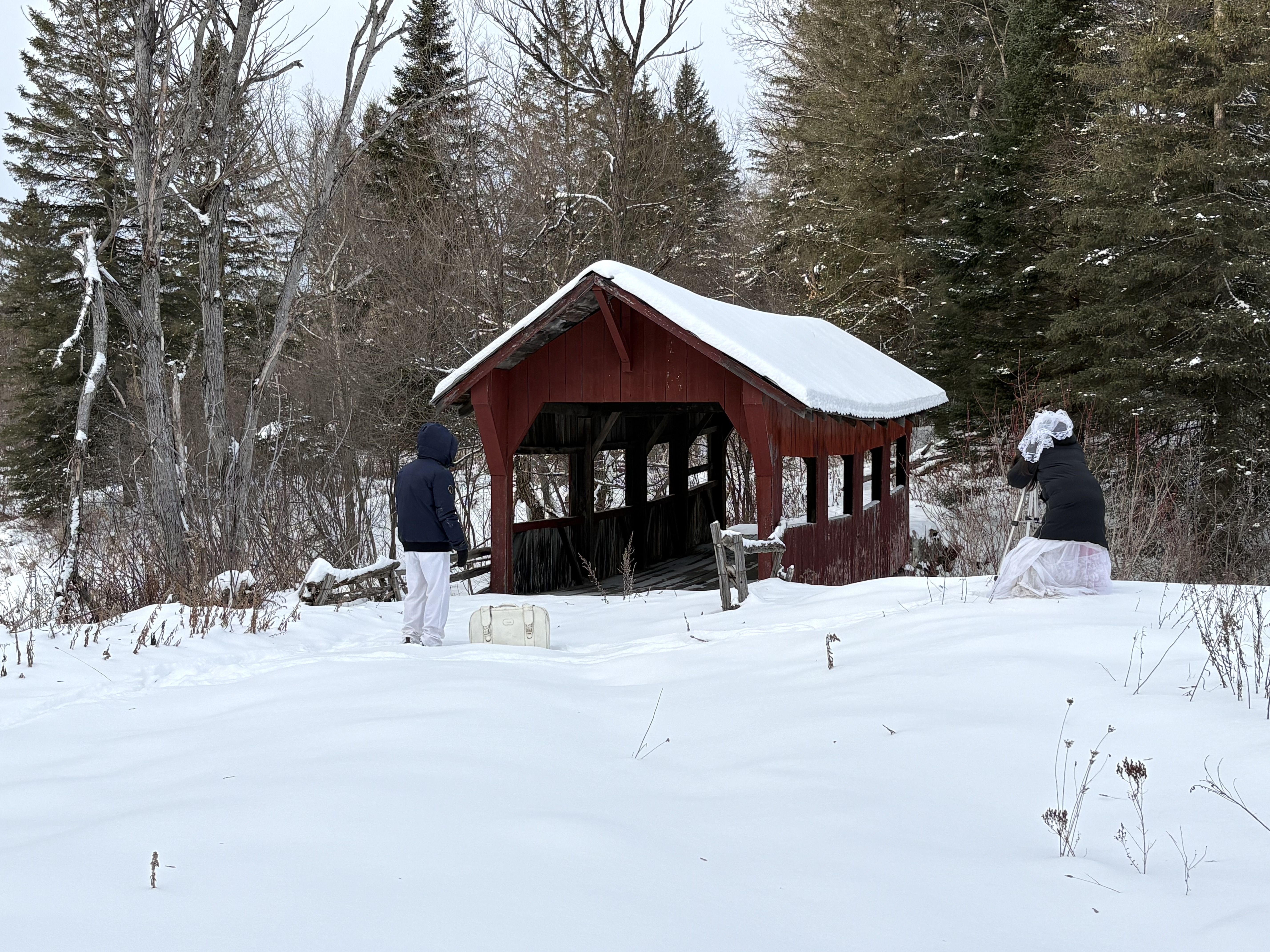 Le projet photographique Témoins de notre histoire s’est terminé en juillet 2023 avec l’ultime mise en scène au pont Émile-Lapointe. Pour l’artiste Sylvie Crépeault, c’était le dernier mariage puisque tous les ponts couverts avaient été visités. La seule structure qui avait été écartée du projet est le pont Edward. Il y avait deux raisons pour cela. D’abord, le pont ne dessert plus le réseau routier et il a été reconstruit en utilisant le bois d’un pont couvert emporté par les glaces en 1964. Ensuite, comme il a été reconstruit au Village Canadiana de Rawdon, site fermé au public depuis plus de 30 ans, il n’était pas vraiment accessible. Mais depuis un an tout ceci a changé car le village ouvre à l’occasion pour des évènements spéciaux. Pendant deux week-ends de décembre, un incroyable festival de Noël s’est tenu au village historique. C’était donc l’occasion idéale de ressuciter le projet. Que de plaisir nous avons eu à replonger dans l’aventure… C’était un beau défi avec la neige et le froid et cela donne un cachet bien particulier à la photo retenue. Je joins dans la galerie des photos prises le 7 décembre lors de notre passage à Rawdon. Si tout se passe bien, il est prévu d’ouvrir à nouveau le Village Canadiana au public au courant de l’année. Et pour ce qui est du projet Témoins de notre histoire, tout n’est pas réellement fini car de très bonnes nouvelles sont à venir. Le blogue prend une petite pause pour le temps des Fêtes et sera de retour au début du mois de janvier avec le célèbre bilan annuel. J’en frofite pour souhaiter un Joyeux Noël et une très bonne année 2026 à tous les lecteurs.