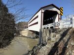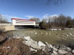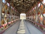 La phase 2 des travaux a eu lieu en novembre et décembre 2023 : on s’est attaqué cette fois au lambris, au tablier et à la couverture. Le pont a été repeint en blanc. Les gabarits portent désormais les mêmes couleurs que le pont. Le panneau historique a été déplacé à l’extérieur de la structure. Les plaques toponymiques ont été remplacées par de nouvelles identiques. Ajout de plaques de métal à l’intérieur du pont pour éviter que des planches soient arrachées dans le but de plonger. Gravures artistiques visibles sur des planches à l’intérieur du pont.